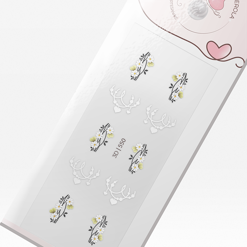 Cartela com 10 unidades. Pode ser usada com qualquer cor de esmalte, pois seu fundo é banco, permitindo assim que a cor da película mantenha-se destacada. Durabilidade de até 30 dias nas unhas.
